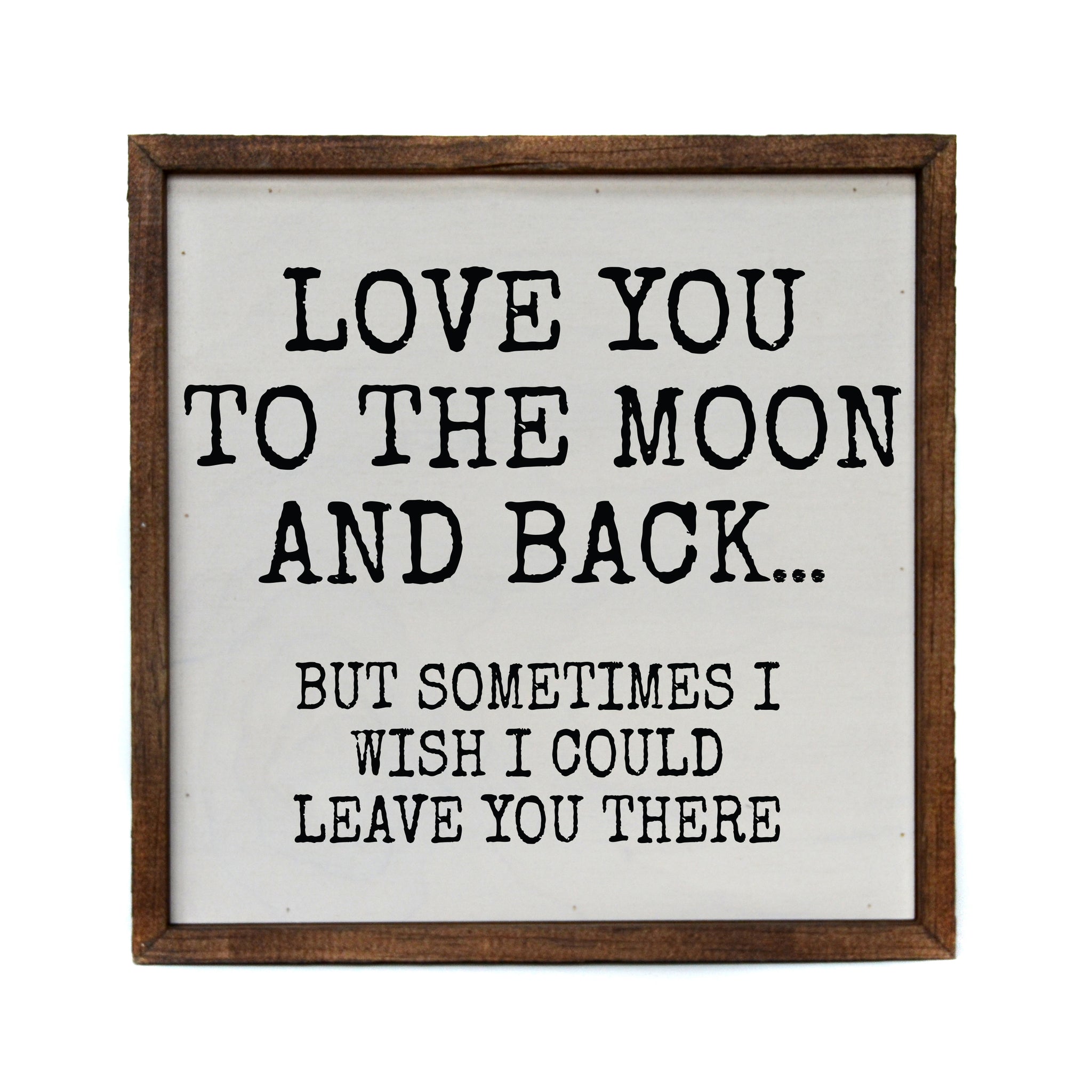 Love You To The Moon And Back Funny Valentine's Day Signs. All our signs are build into a wooden box frame with a rustic touch. Signs are hung directly off the frame or sit perfectly on a desk.